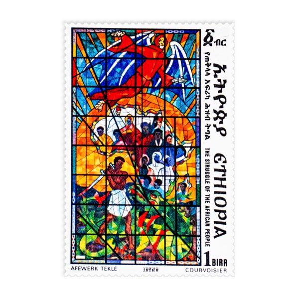 His reputation grew not only within the country but also internationally. His drawings. paintings. murals, mosaics. stained-glass windows and sculpture. his designs for stamps. playing cards, posters. flags and national ceremonial dresses, all went to build up his position as Ethiopia’s foremost artist.