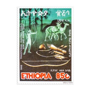 The bow and arrow have been the most generally used and most widely dispersed of all weapons from its earliest days until the 16th century. Later it also became a favorite implement of sport. The one shown in the 85c stamp is particularly in use in Bale region, Ethiopia.